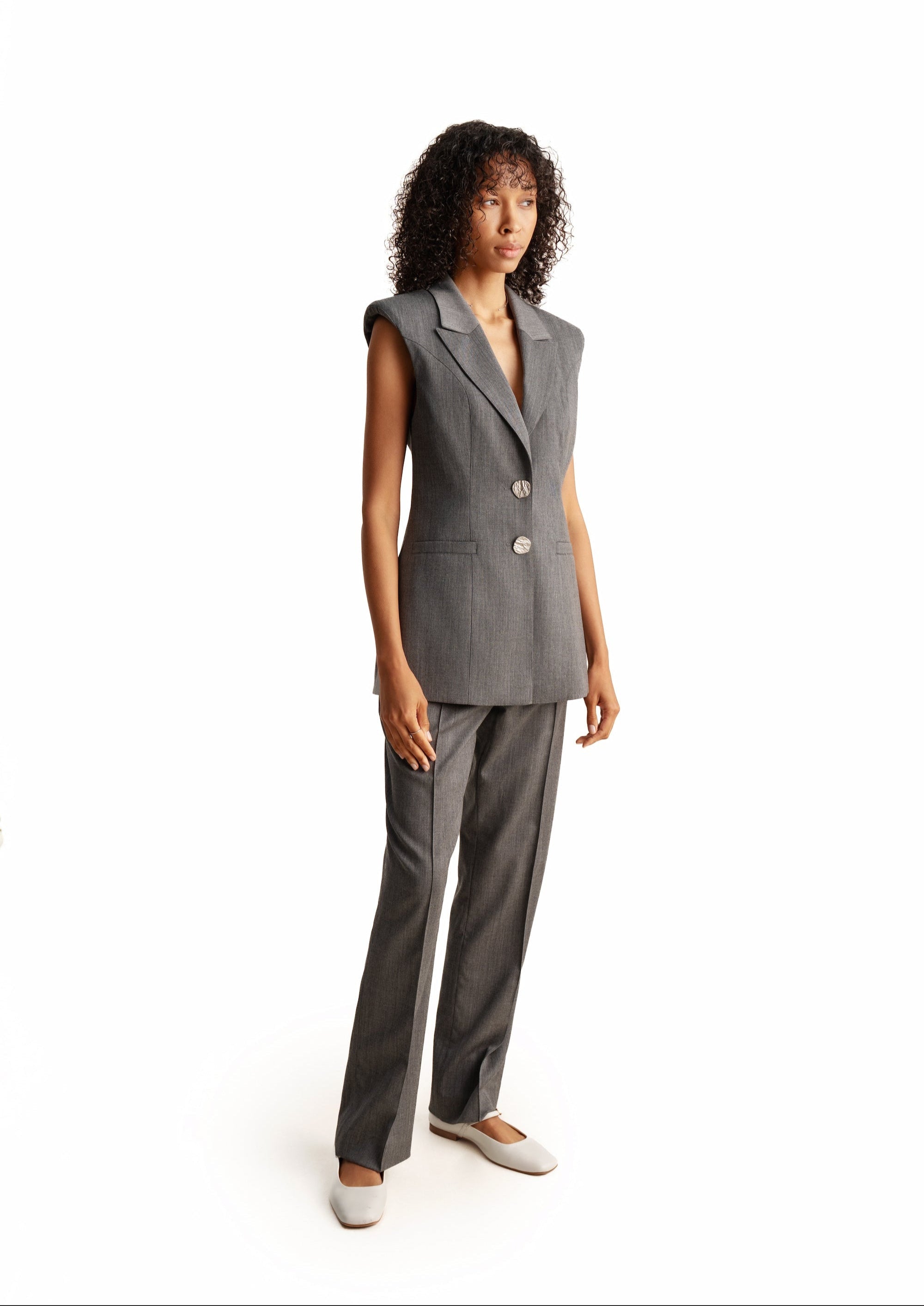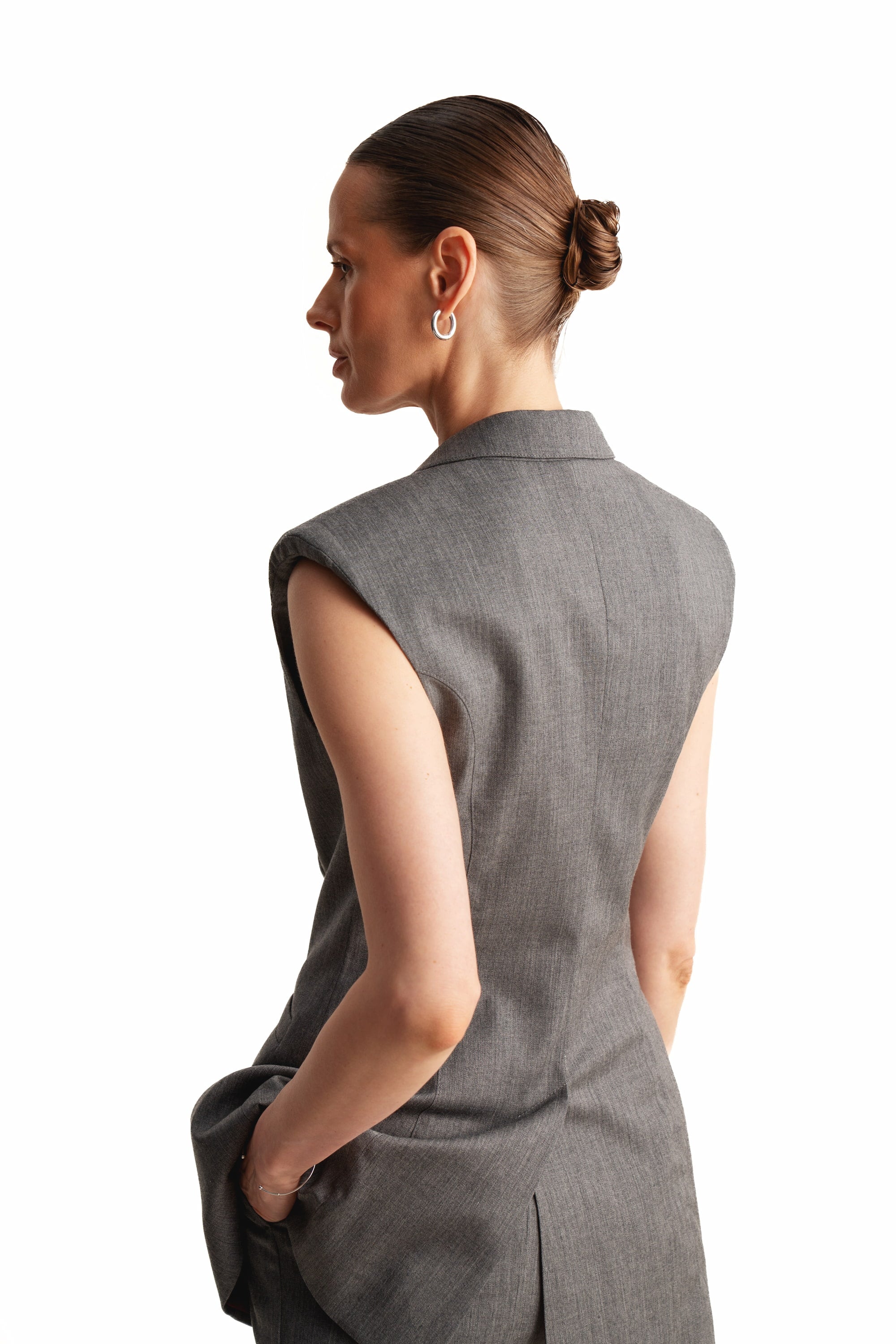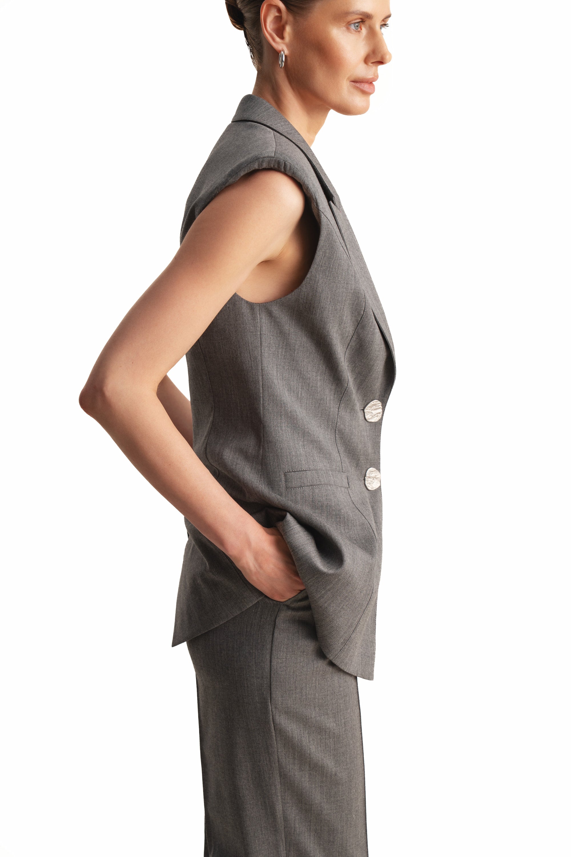 Подовжений жилет з акцентними плечима — мінімалізм із характером. Виготовлений з італійської вовни. Витончені рельєфи підкреслюють силует на талії, а бордова підкладка додає несподіваної глибини. Створює елегантний акцент у поєднанні зі спідницею або брюками, підходить для ділових і повсякденних образів.